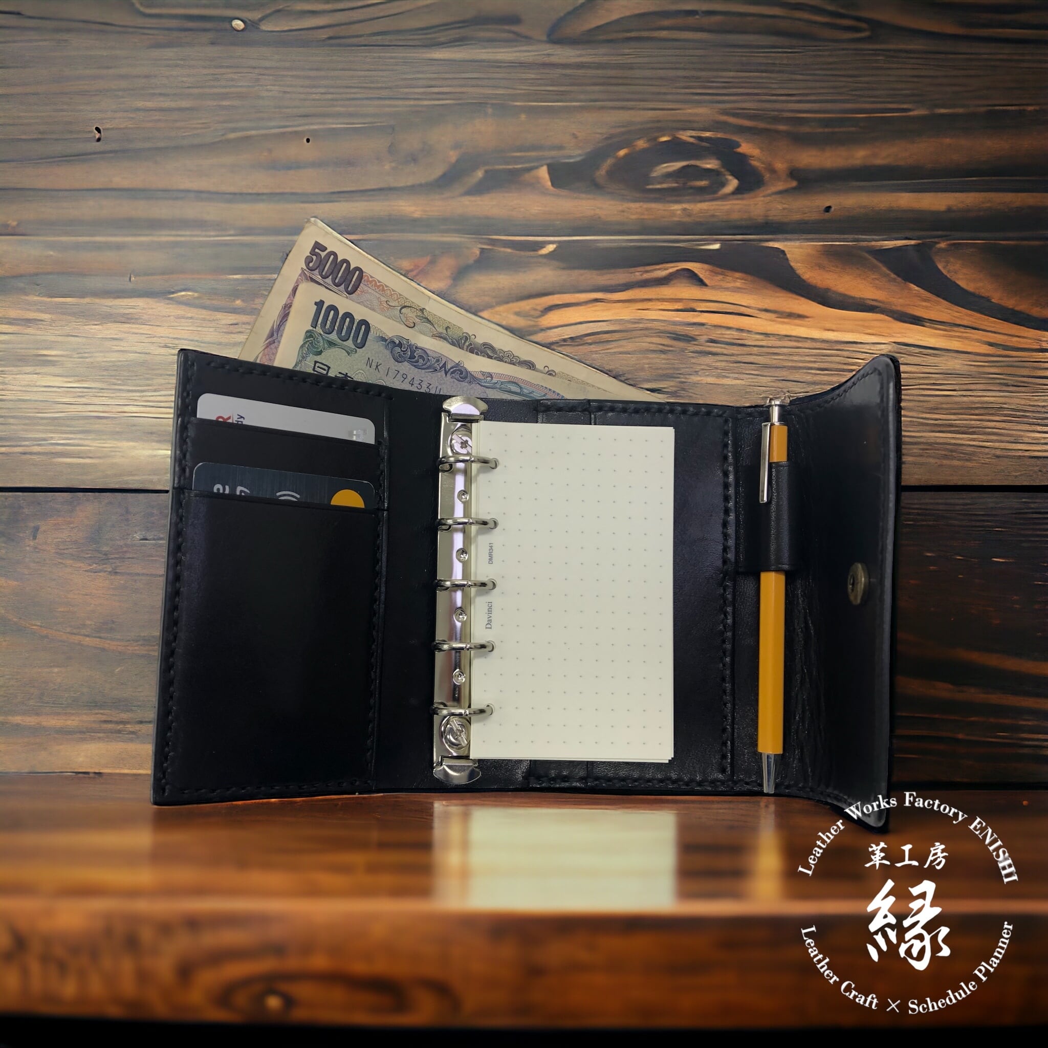 お財布機能を備えた当工房オリジナルのミニ5穴システム手帳です。